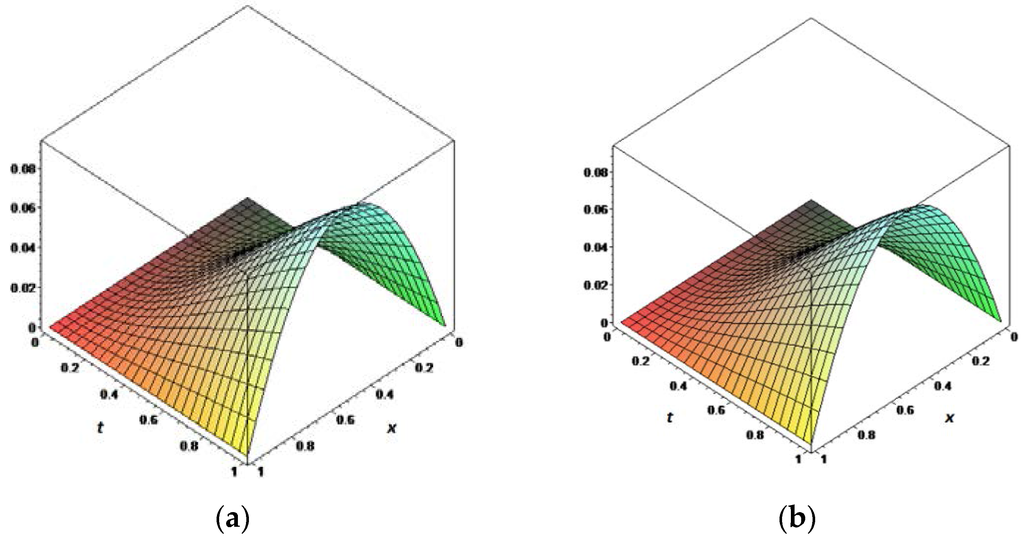 By using the solution algorithm in given Section 3, we find the Fibonacci polynomial solution of the problem is , which is the exact solution of the problem. Further, we can obtain the exact solution of the problem for the any value of