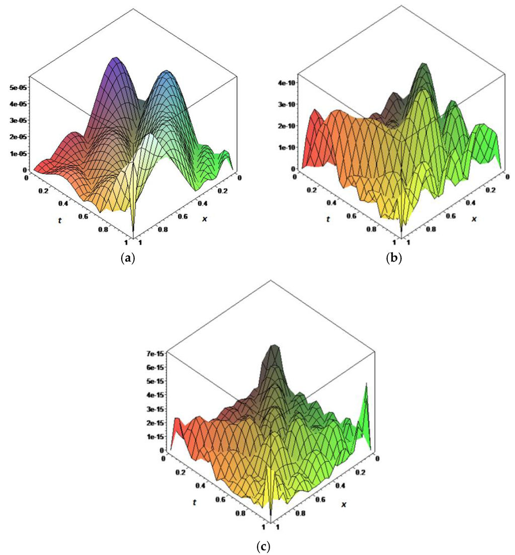 Graphs of the absolute errors functions of Example 3 for . (a) The absolute error function for N = 7; (b) The absolute error function for N = 11; (c) The absolute error function for N = 14.