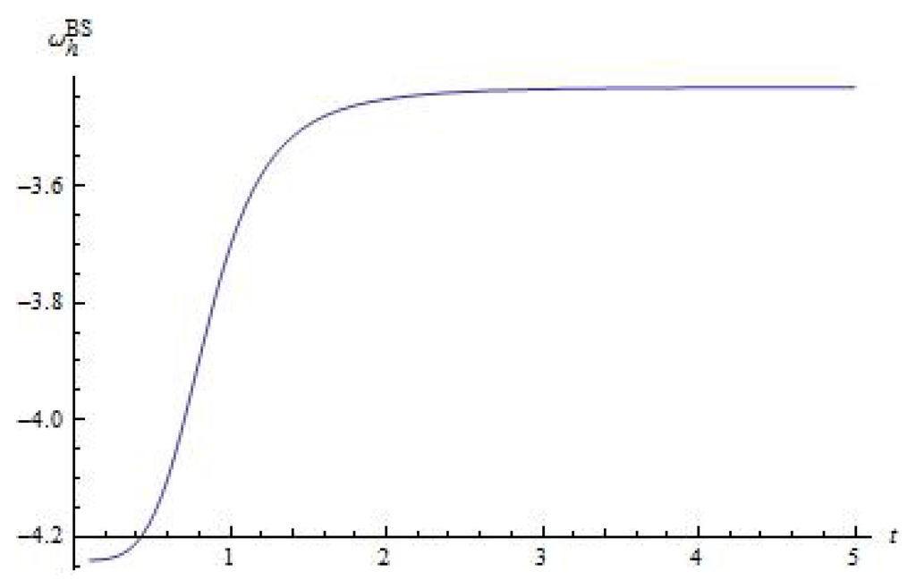In this figure we plot the equation-of-state parameter of the holographic energy in fractal geometry for the basic scenario versus time (here we assumed that and ).