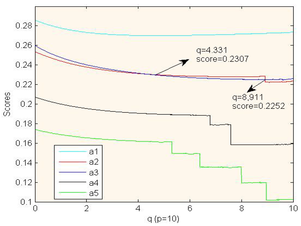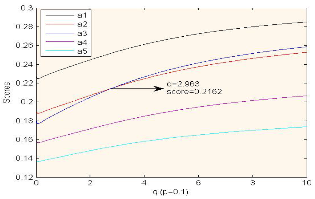 - Different values of parameters p and q could lead to different scores and a different ranking order. For example, when p = q = 5, the second order of the alternative is while this result varies when p and q were set with other values.