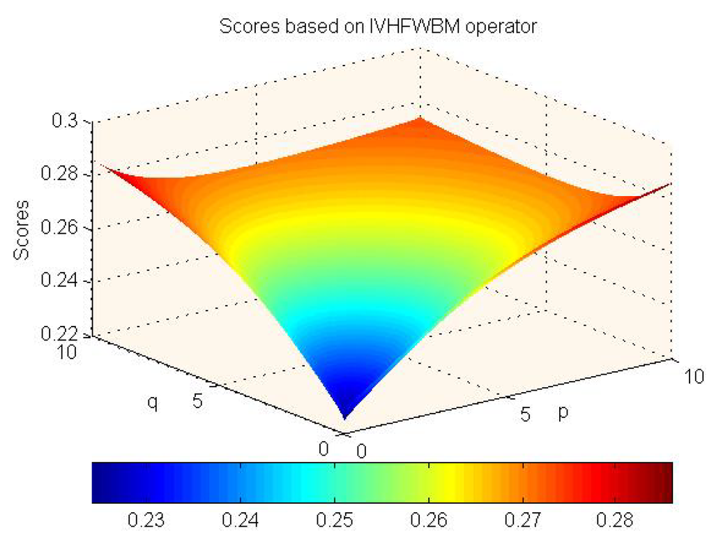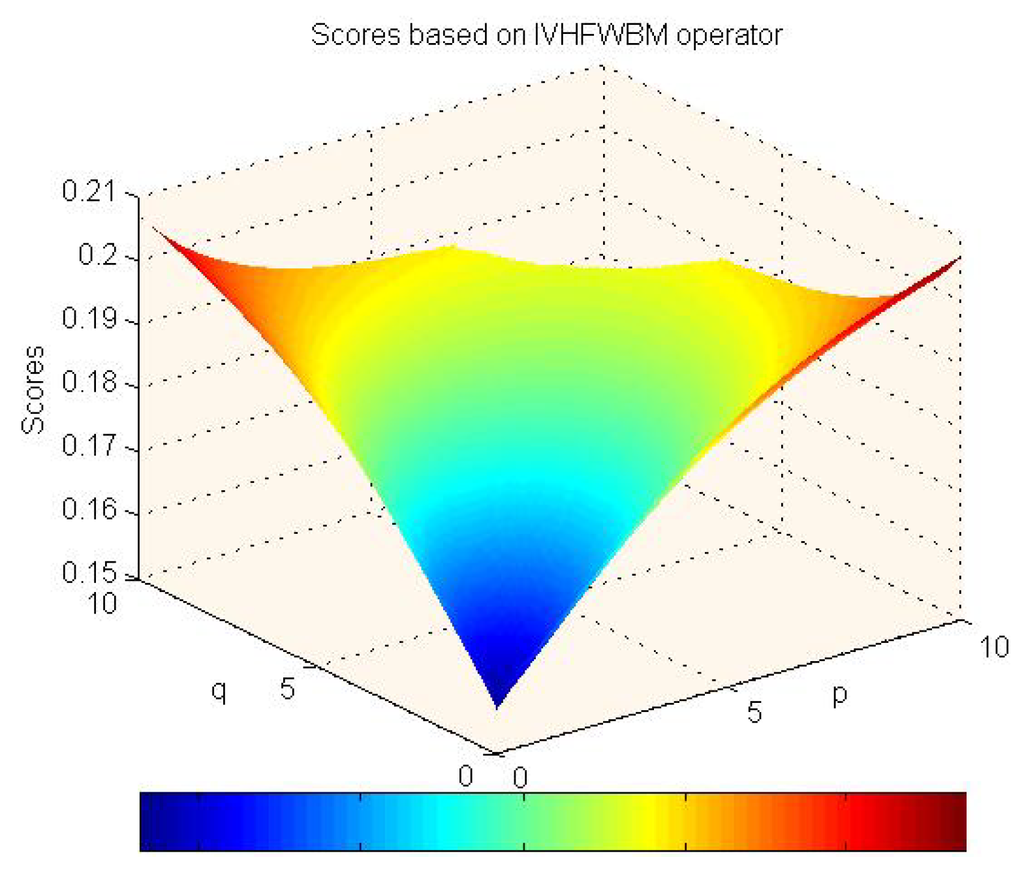 - The scores obtained by the IVHFWBM operator are symmetrical. For example, the scores are not changed between p = 0.001 (q = 10) and p = 10 (q = 0.001). This result verified the phenomenon described in Section 3.