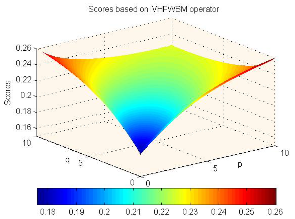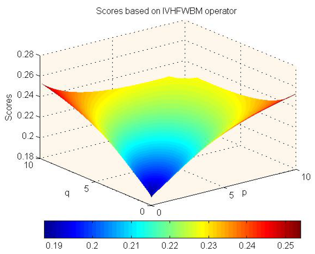 In the following, we will investigate the changing trend of the scores for the aggregated IVHFEs based on the IVHFWBM operator when one of the two parameters is fixed. As mentioned above, the parameters p and q have same effect on the aggregated results; therefore, we only study the case that the values of parameter p are fixed.