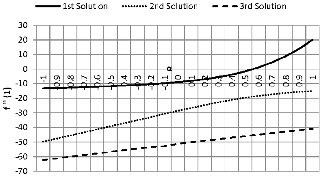 To have a pervasive understanding of the triple solutions we plot skin friction against wall expansion or contraction ratio in Figure 2. From this figure it is observed that skin friction increases monotonically by the variation of . Physically we can say that variation of from to (contracting walls to expanding walls) increases wall drag. This is only because, in the case of expanding walls, flow towards the center become fast due to the space caused by wall expansion. Moreover, a slip regime exists near the wall. Therefore, for expanding walls skin friction increases numerically for all the solutions. It is worth highlighting that there exists only single solution in the case of injection and triple solutions are exist only for the case of suction . However, to conserve space, we only include the results for the case of suction in this paper.