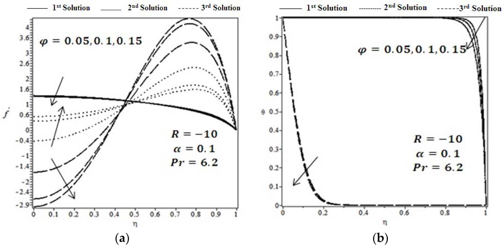 Figure 3 depicted the behavior of velocity profile and temperature profile for the variations of solid volume fraction for the fixed values of Reynold number and wall expansion ratio . It is noticed that velocity profile decreases near the center of the channel for the 1st and 3rd solutions. However, the reverse phenomena for the case of 2nd solution is observed. Similarly, the effect of solid volume fraction on temperature profile is presented in the same figure. Temperature profile is decreased as the strength of solid volume fraction increases. Moreover, asymptotical behavior is also observed for the 3rd solution.