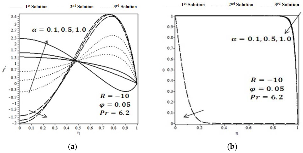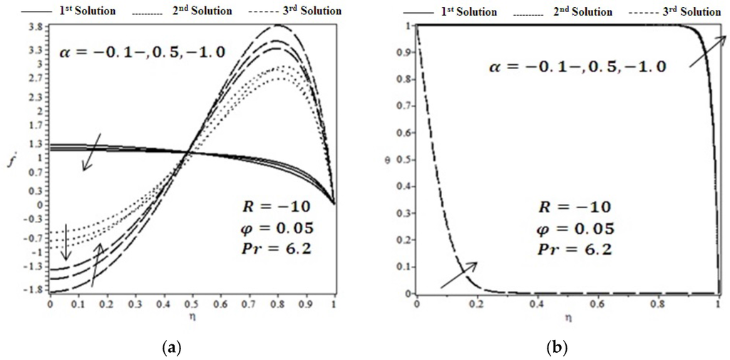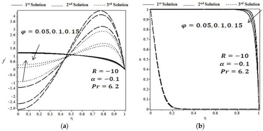 Figure 4a,b show the effect of solid volume fraction for the fixed values of Reynold number and wall expansion ratio on velocity and temperature profiles, respectively. It is observed that the trend of fluid velocity and temperature profile are the same as for expanding walls, . The effect of wall expansion on velocity and temperature is depicted in Figure 5a,b, respectively. It is seen from Figure 5 that velocity near the center of the channel increases for 1st and 2nd solutions and decreases for the 3rd solution. However, the opposite happens near the wall. This is because fluid moves freely near the center of the channel due to the space generated by the wall expansion, so therefore fluid velocity increases gradually near the center of the channel . Furthermore, temperature profile decreases gradually by increasing the values of wall expansion, and asymptotical behavior is observed for the 3rd solution. Figure 6 presented the effect of wall contraction on velocity profile and temperature profile for the fixed values of solid volume fraction for the fixed values of Reynold number . On the other hand, velocity profile decreases near the center of the channel and increases near the channel wall for the case of wall expansion ratio as shown in Figure 6. Contracting walls provide less space for the fluid to flow so therefore fluid velocity near the center of the channel decreases, flow towards the channel wall becomes more noticeable and temperature profile increases for all the solutions.