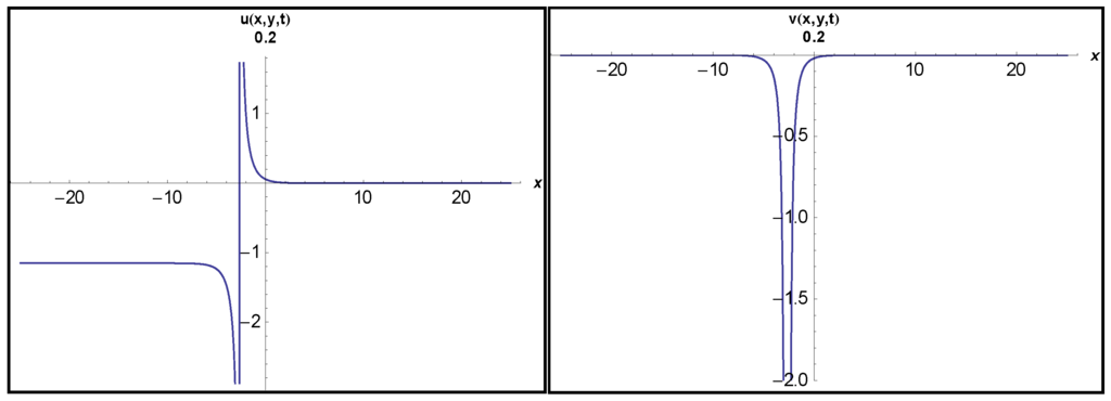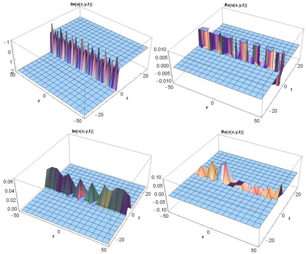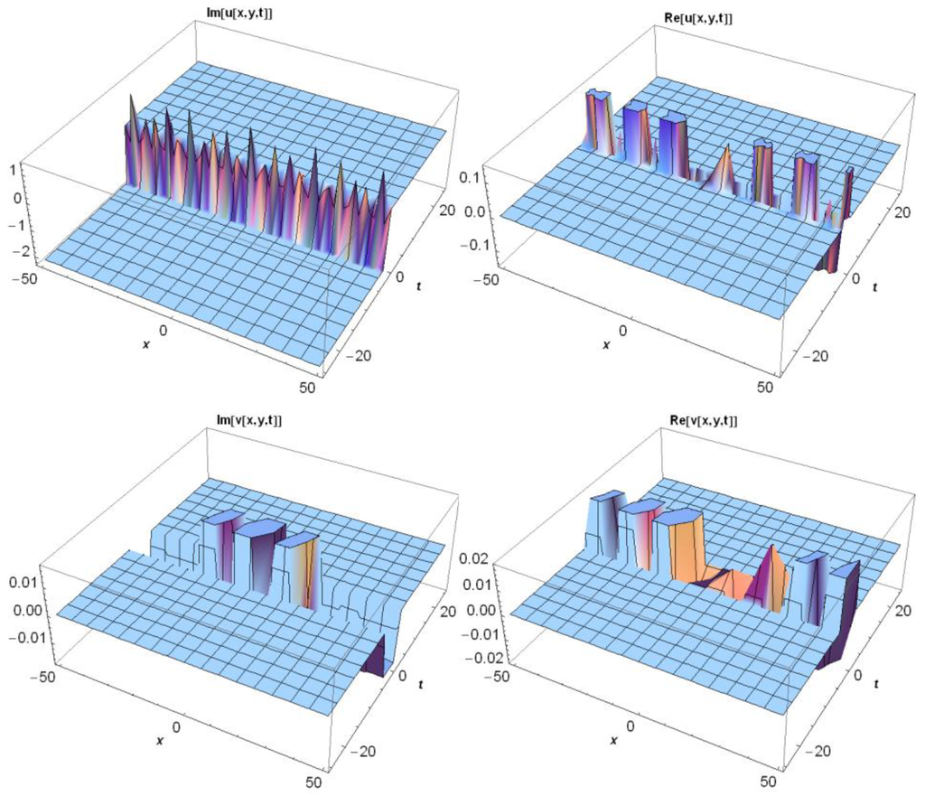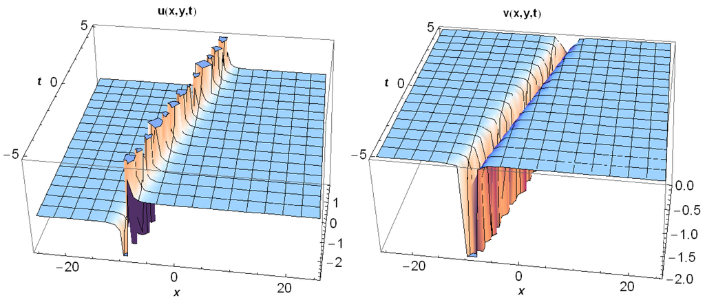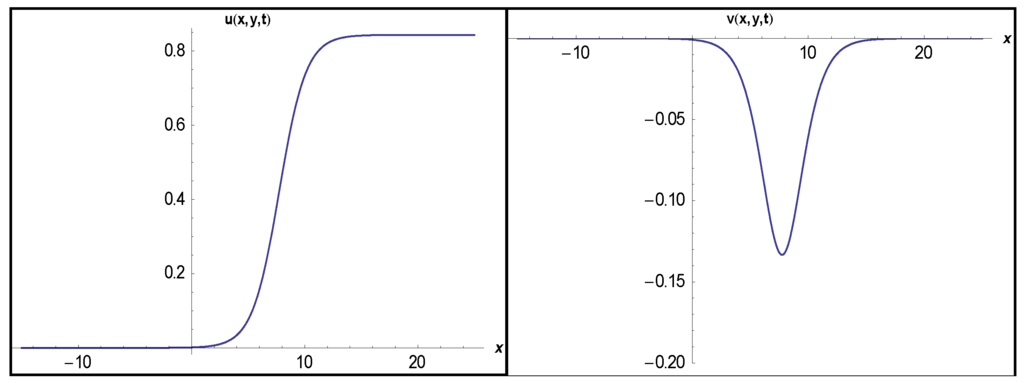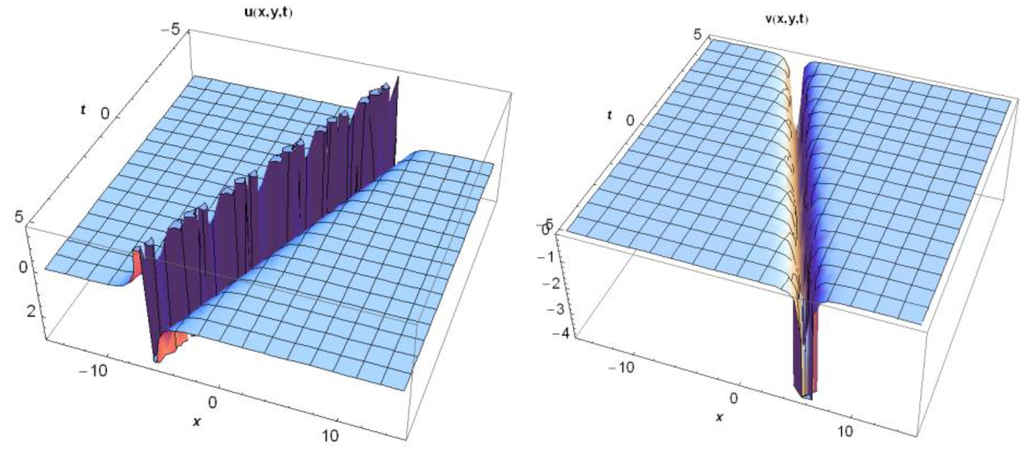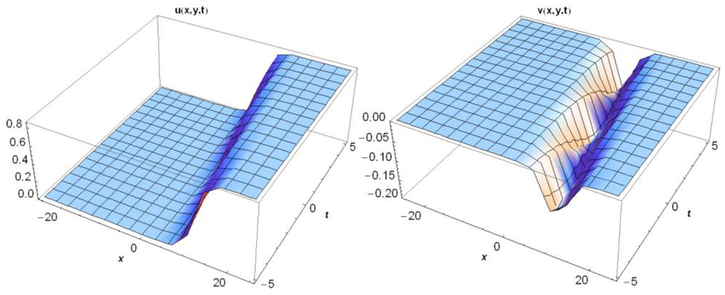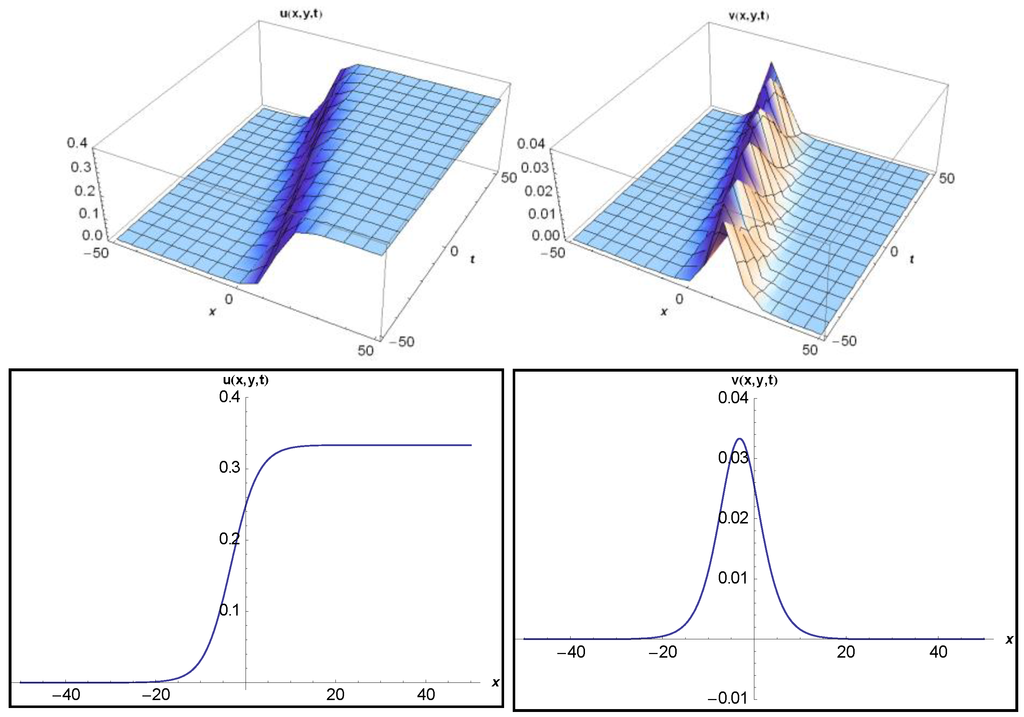Therefore, when we substitute coefficients Equations (33) along with (8) in (31) for u(x, y, t) and in Equation (23) for v(x, y, t), we can obtain hyperbolic function solution to the DLW system (1) as the following, under the condition of Family-1;