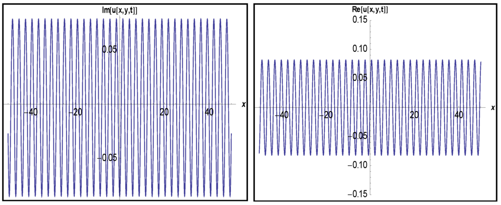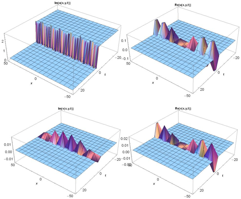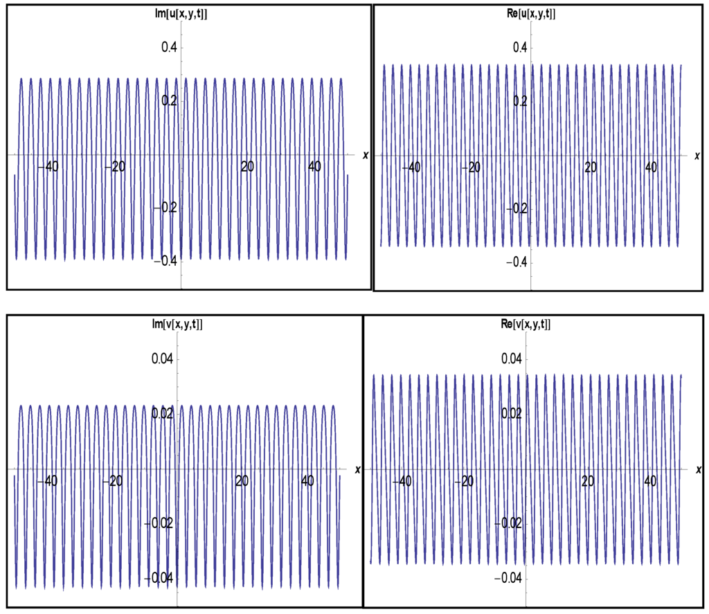 where u = u(x, y, t) represents the horizontal velocity of water and v = v (x, y, t) gives the deviation height from the equilibrium position of the liquid [16]. The solutions of (1) are very helpful for coastal scientists and engineers to apply the nonlinear water model to coastal and harbor design [17,18,19]. Equation (1) was used to model nonlinear and dispersive long gravity waves traveling in two horizontal directions on shallow waters of uniform depth. Equation (1) appears in many scientific applications such as nonlinear fiber optics, plasma physics, fluid dynamics, and coastal engineering [16].