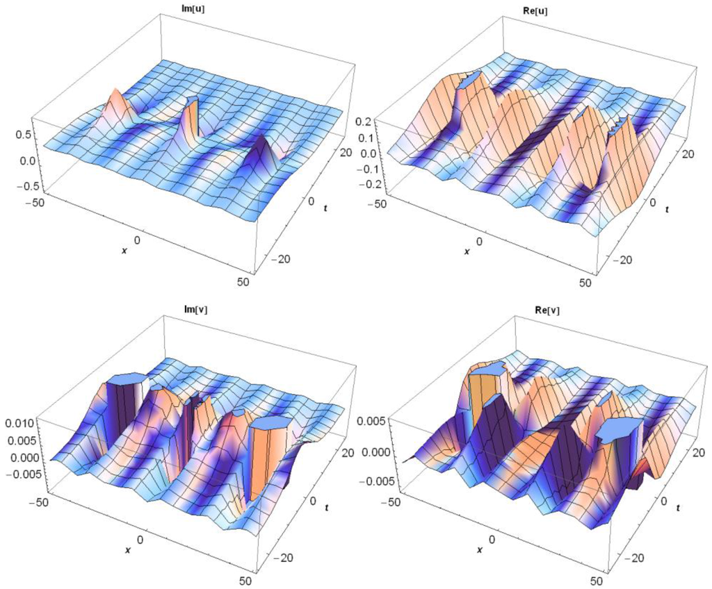 The 3D surfaces of Equation (40) by considering the values A1 = 2, A2 = 3, c = 5, λ = 0.2, ω = 0.12, ε = −3, y = 0.2, −50 < x < 50, −25 < t < 25.