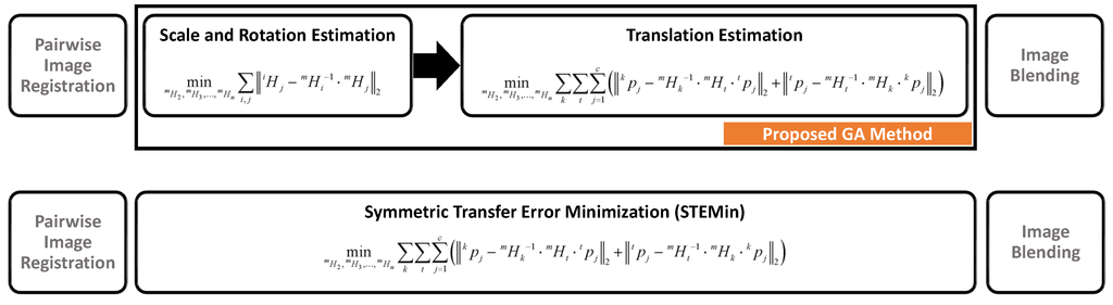 Our GA approach is motivated by the constraints imposed by relative transformations between overlapping images as absolute transformations should meet the constraints introduced by them. We use similarity type planar transformations as they generally contain enough Degrees of Freedom (DOFs) for optical mapping with robotic platforms [15]. A pipeline of the proposed GA method is illustrated in Figure 2.