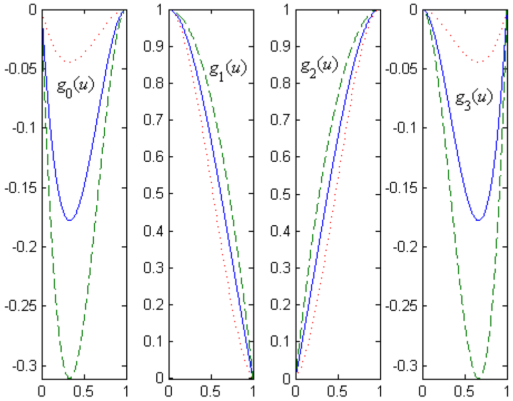 Because the new basis functions hope to satisfy the same properties at the end points with the standard cubic Catmull-Rom basis functions, thus, let and in Equations (3) and (4), respectively. Then,