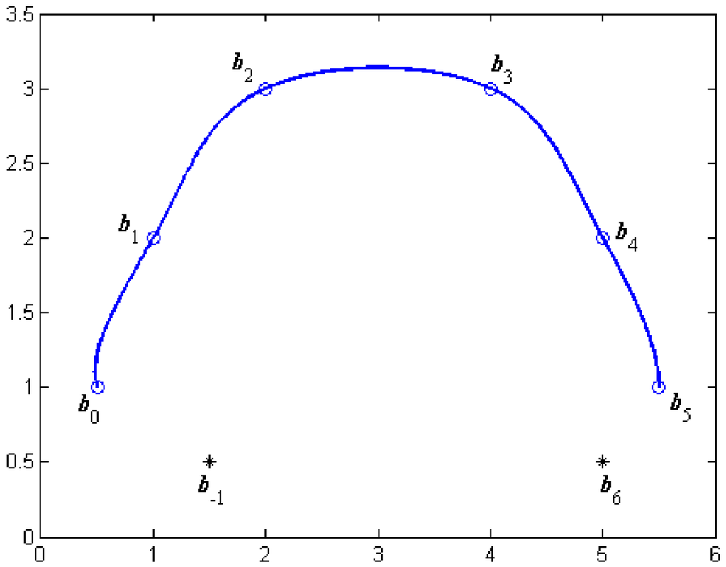Equation (11) shows that the curves interpolate the given control points expect and . From Equations (11) and (12), it follows that