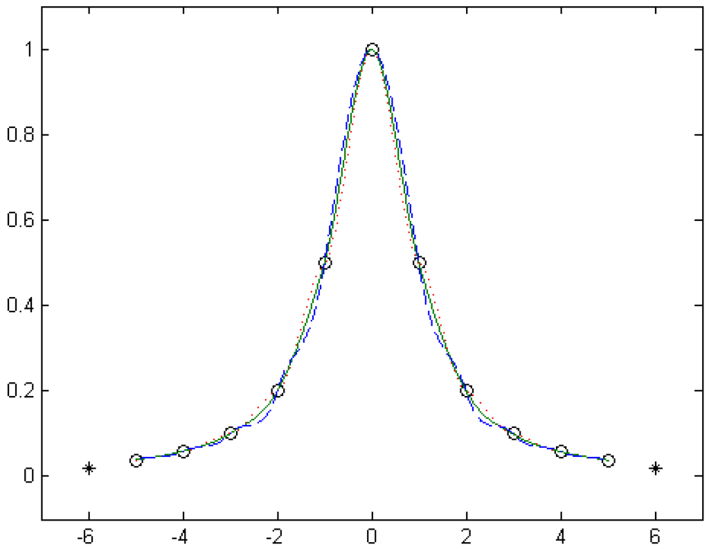 The curves of the optimum cubic α-Catmull-Rom spline interpolation function for n = 10 (marked with solid lines) and the standard cubic Catmull-Rom spline interpolation function (i.e., the shape parameter is taken as , marked with dashed lines) are shown in Figure 7.