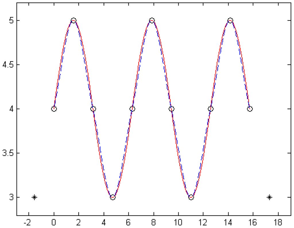 Figure 6 shows the curve of the C1 continuous cubic α-Catmull-Rom spline interpolation function adjusted by the shape parameter α, where the value of α is taken as (marked with dotted lines), (marked with solid lines) and (marked with dashed lines), respectively.