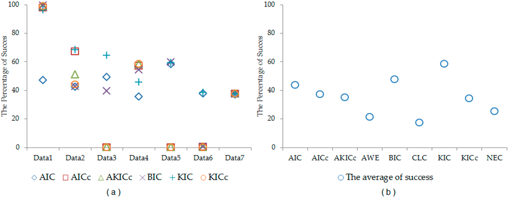 According to synthetic data sets, (a) the percentage of success for the determination of the number of clusters from the best six information criteria and (b) the average of success in determining the number of clusters from the information criteria.