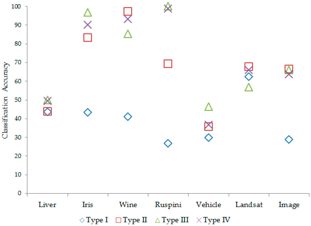 According to Table 10, the Type III covariance matrix of each subgroup has generally performed better in the results, both in terms of the correct classification and the minimum information criteria value. The classification accuracy in mixture clustering based on a mixture of multivariate normal distributions according to covariance types is given in Figure 2.