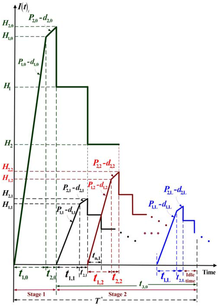 This study incorporates component commonality, postponement strategy, and quality assurance into a two-stage multi-product fabrication-distribution EPQ-based system. It is assumed that annual demands λi for different products L (where i = 1, 2, …, L) need to be satisfied. These L end products share a common intermediate part and are fabricated by a two-stage process. The first stage produces common components for L different products and the second stage manufactures in sequence L customized end products with the aim of maximizing machine utilization. The objectives of this study are to minimize the total production-inventory costs and shorten replenishment cycle time. In stage one, the common intermediate component is produced at a rate of P1,0, it follows that L different customized end products are fabricated in sequence and under a common production cycle time policy (see Figure 1), at a production rate of P1,i in stage two (where i = 1, 2, …, L). All items produced are screened and the inspection cost per item is included in the unit production cost Ci. As described by most of the realistic production systems, the processes in each stage (either for the common intermediate part or for the end products) may randomly produce xi portion of defective items at a production rate d1,i; hence, d1,i = P1,i xi (where i = 0, 1, 2, …, L; and i = 0 denotes that it is for the production of common intermediate part in stage one).