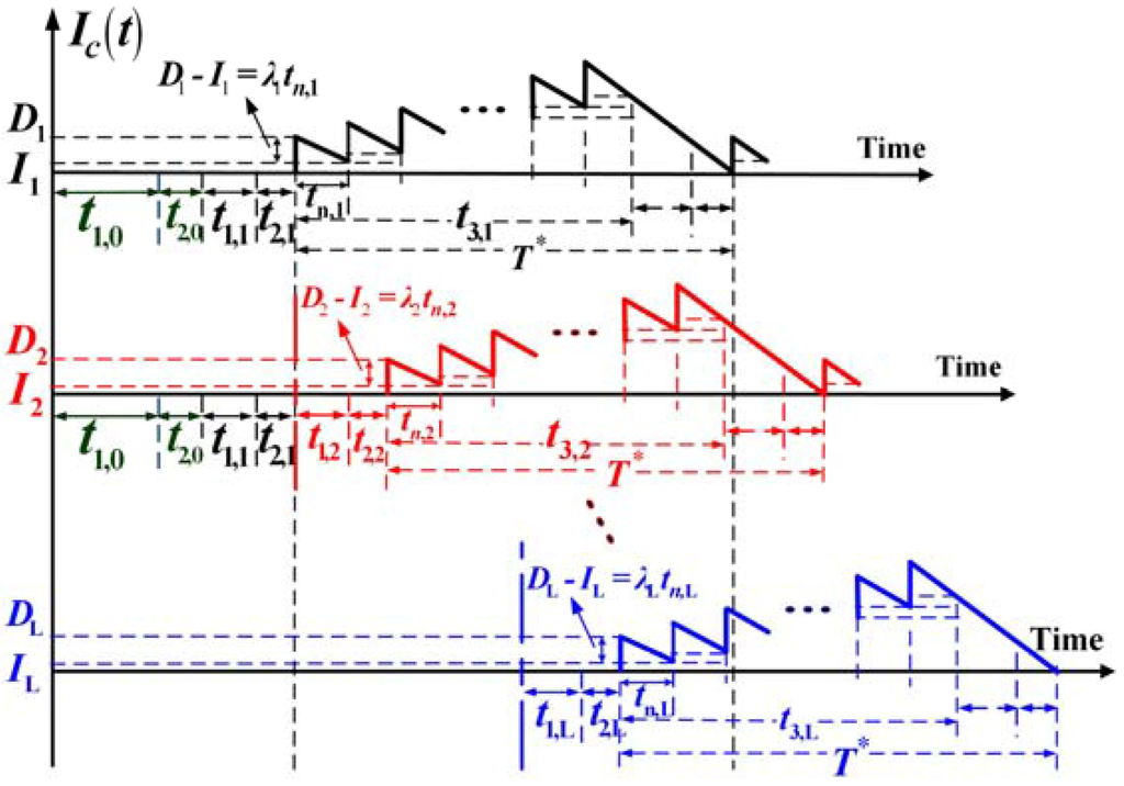 The on-hand inventory level of end products at the customer’s side during a production cycle is depicted in Figure 5. We can observe the following formulas directly from Figure 1 and Figure 5: