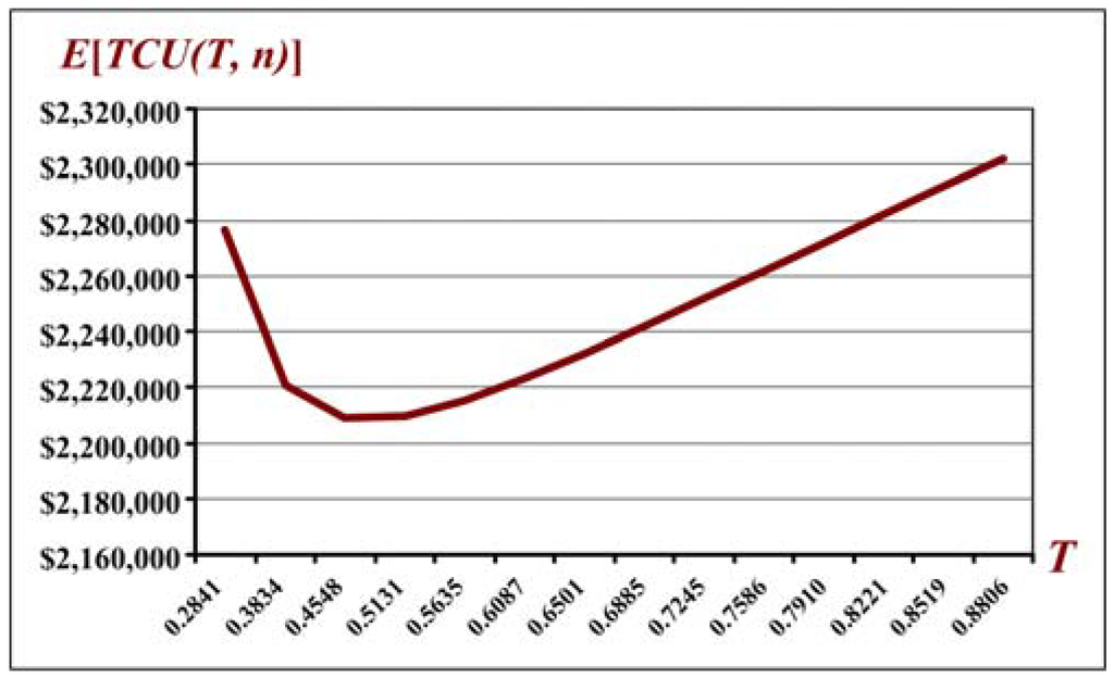 Applying Equation (3), we find the overall scrap rate for stage one, φi equal to 0.36. By computing Equations (1) and (4), we also obtain the annual demand for common intermediate parts λ0 as 17,570. By calculating Equations (35), (36), and (32), we find the optimal number of deliveries n* = 3, the optimal production cycle time T* = 0.4600 (years), and the long-run average system costs per unit time E[TCU(T*, n*)] = $2,209,201. Figure 6 illustrates the behavior of E[TCU(T, n)] with respect to common production cycle time T.