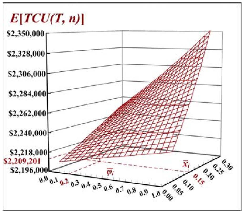 Assuming that the values of the other variables remain the same as stated in the previous subsection, i.e., P1,0 = 120,000, P2,0 = 96,000, x0= [0, 0.04], θ1,0 = 0.20, θ2,0 = 0.20, and φ0 = 0.36. Therefore, in stage two the following cost parameters can be obtained accordingly: Ki = $3507, $4007, $4507, $5007, and $5507, respectively; C,i = $17, $27, $37, $47, and $57, respectively; unit reworking costs CR,i are $10, $15, $20, $25, and $30, respectively; unit scrap costs CS,i are $4, $9, $14, $19, and $24, respectively. The random defect rates xi follow the uniform distribution over the intervals [0, 0.01], [0, 0.06], [0, 0.11], [0, 0.16], and [0, 0.21], respectively; scrap rates θ1,i = 0.10, 0.15, 0.20, 0.25, and 0.30, respectively; and θ2,i = 0.10, 0.15, 0.20, 0.25, and 0.30, respectively. We apply Equations (35), (36), and (32) to obtain the optimal number of deliveries n* = 3, the optimal common production cycle time T* = 0.3991 (years), and the long-run average system costs per unit time E[TCU(T*, n*)] = $2,163,075. It is noted that in this nonlinear case, production cycle time T* is shortened by 13.24% and the expected system costs E[TCU(T, n)] is decreased by 2.09% as compared to that in the case of the linear one.