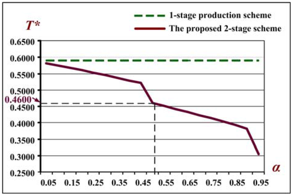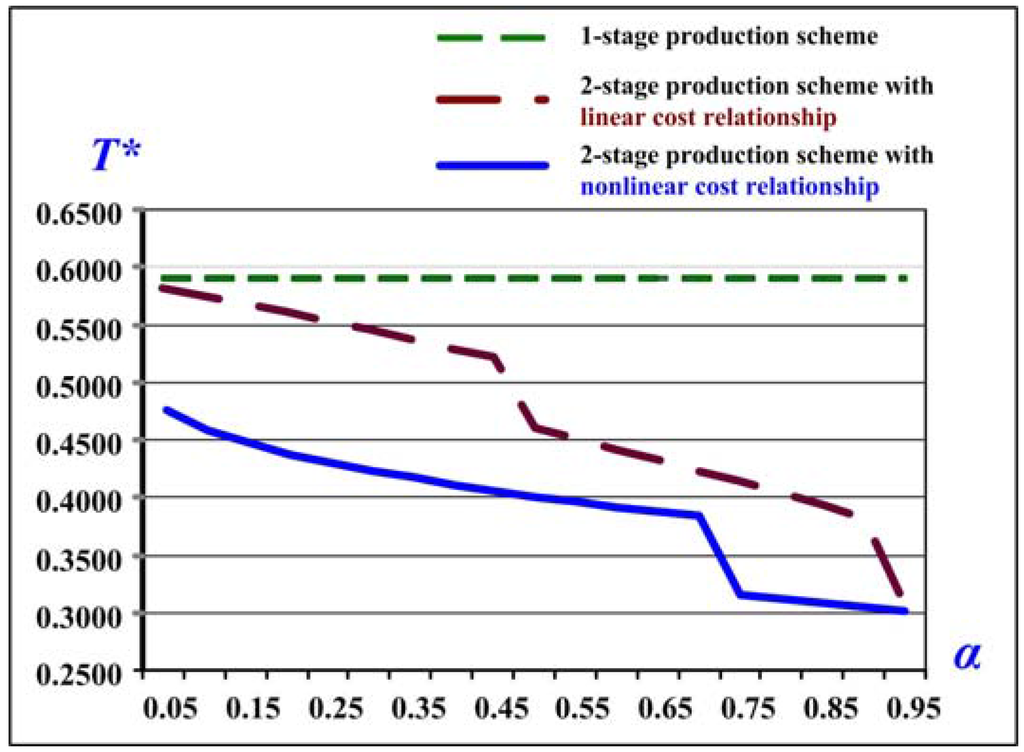 Figure 10 shows the behavior of the optimal production cycle time T* with respect to common intermediate part’s completion rate α under both linear and nonlinear relationships. In the nonlinear relationship between a common part’s relevant costs and its completion rate, as the completion rate α increases, the optimal production cycle time T* decreases significantly, indicating that the proposed two-stage multi-item production scheme with delayed differentiation provides a shorter production cycle time (or response time) than that in a conventional one-stage multi-item production system [7]. The analytical results also reveal that if the common intermediate part’s relevant costs are higher (e.g., have a nonlinear relationship α^(1/3) rather than linear one), then the optimal production cycle time T* decreases significantly compared to the linear case.