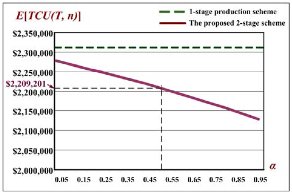 Figure 9 depicts the behavior of E[TCU(T, n)] with respect to common intermediate part’s completion rate α. The illustration demonstrates that as the completion rate α increases, the long-run expected system cost E[TCU(T, n)] decreases. It is also noted that the proposed study realized an overall system cost savings of 4.63% at α = 0.5 (i.e., system costs decreased from $2,316,483 to $2,209,201) as compared to that in a prior study which used a single-stage production scheme. This result implies that the proposed two-stage multi-product production scheme with delayed differentiation is a considerably beneficial model to producers who must satisfy demands for multiple products that share a common intermediate part.