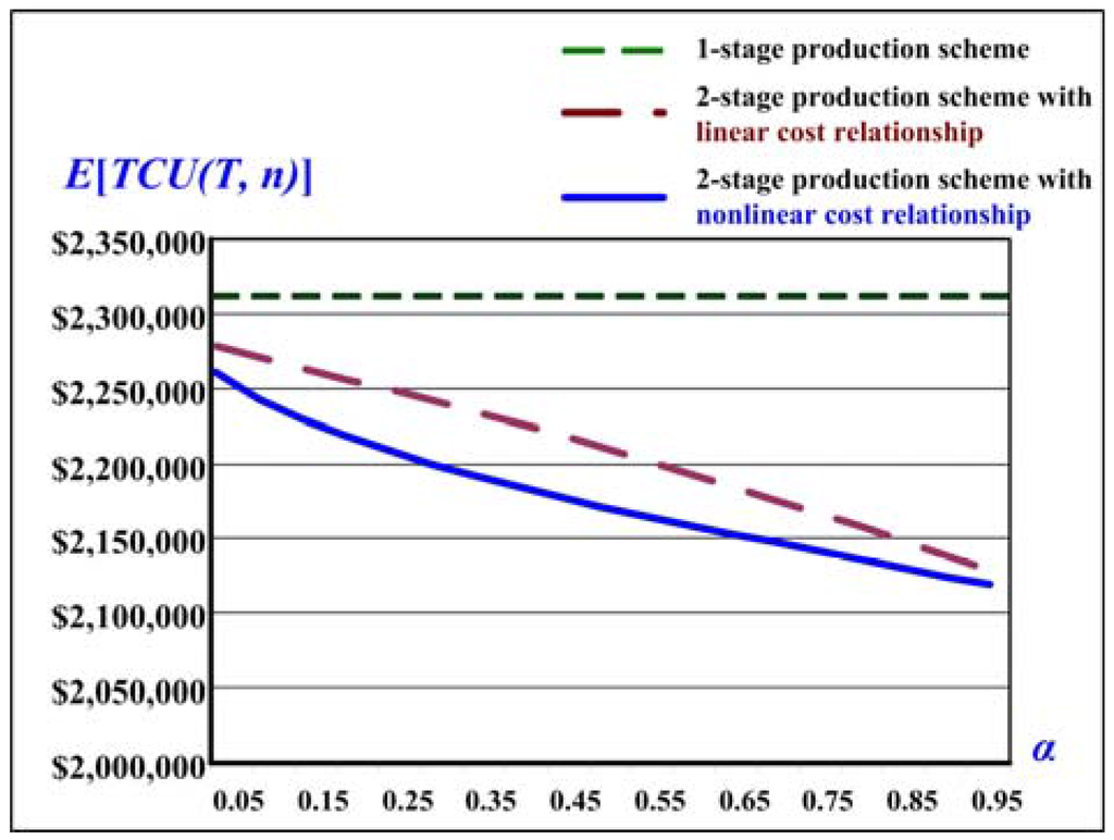 Figure 11 illustrates the behavior of E[TCU(T, n)] with respect to the common intermediate part’s completion rate α under both linear and nonlinear relationships. It is noted that in the nonlinear relationship between a common part’s relevant costs and its completion rate, as the completion rate α increases, the long-run expected system cost E[TCU(T, n)] decreases. The proposed two-stage multi-product production scheme with delayed differentiation is therefore a considerably beneficial model to producers who must satisfy demand for multiple products that share a common intermediate part. The analytical results also demonstrate that if the common intermediate part’s relevant costs are higher (e.g., have a nonlinear relationship α^(1/3) rather than linear one), then the expected system cost E[TCU(T, n)] decreases significantly compared to the linear case.