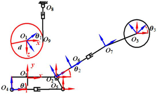 The geometry relation graph is shown in Figure 3. Supposing that the turntable is rotated along the frame O1, the cutting arm rotates along the frame O2, the cutting head rotates along the frame O3, the drive cylinder of the cutting arm is hinged with the turntable and the cutting arm by the point O4 and O5, respectively. The distance between the points O6 and O7 represents the length of the slip sleeve’s extending and shrinking. The driving cylinder of the turntable is fixed with the main engine by the point O8, the gear of the turntable is engaged with the rack by O9. Constructing the body frame and the inertial frame at these points respectively, the rotation direction of the body frames is all along the anticlockwise direction [23].
