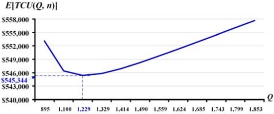 For π = 0.4, the behavior of E[TCU(Q, n)] with respect to the lot size Q is illustrated in Figure 4.