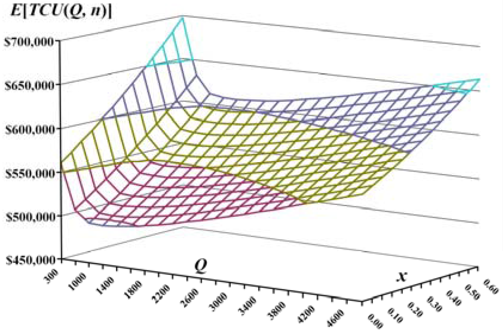 The joint effects of different lot size Q and scrap rate x on the expected system cost E[TCU(Q, n)].