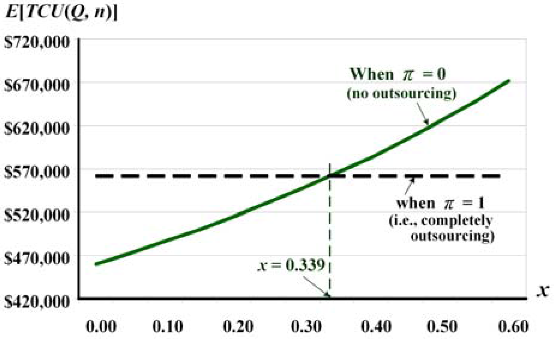 Further analysis indicates that a critical scrap rate exists at x = 0.339 (see Figure 6). Meaning that if the scrap rate of a production system exceeds this critical point, then the completely outsourcing policy (i.e., π = 1) becomes the better choice than a partial or no outsourcing option, in terms of cost savings.