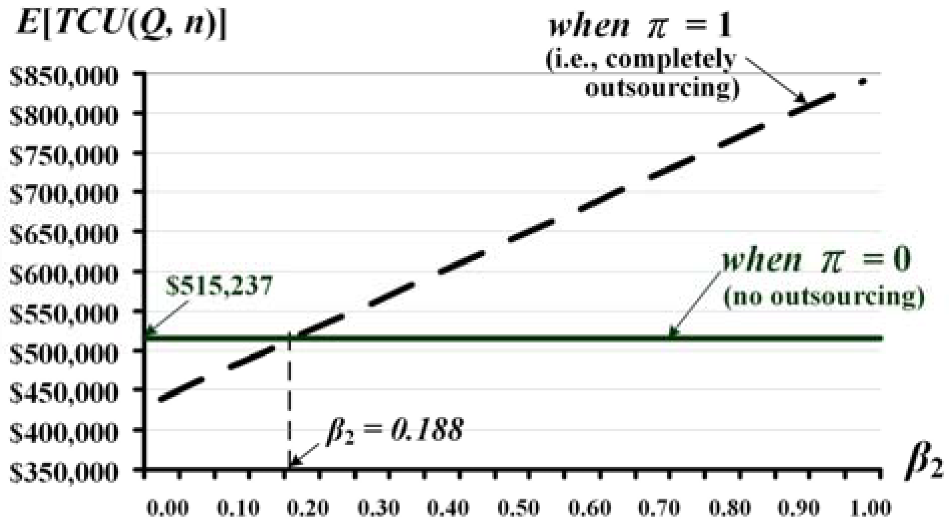 A further analysis reveals that a critical outsourcing cost factor β2 exists (see Figure 7) at β2 = 0.188, in the numerical example with a uniformly distributed scrap rate range of [0, 0.2]. This represents that if the outsourcing cost factor β2 is less than the critical point (i.e., Cπ < $118.80), then the completely outsourcing policy (i.e., π = 1) turns into the better choice than a partial or no outsourcing option, in terms of cost savings.