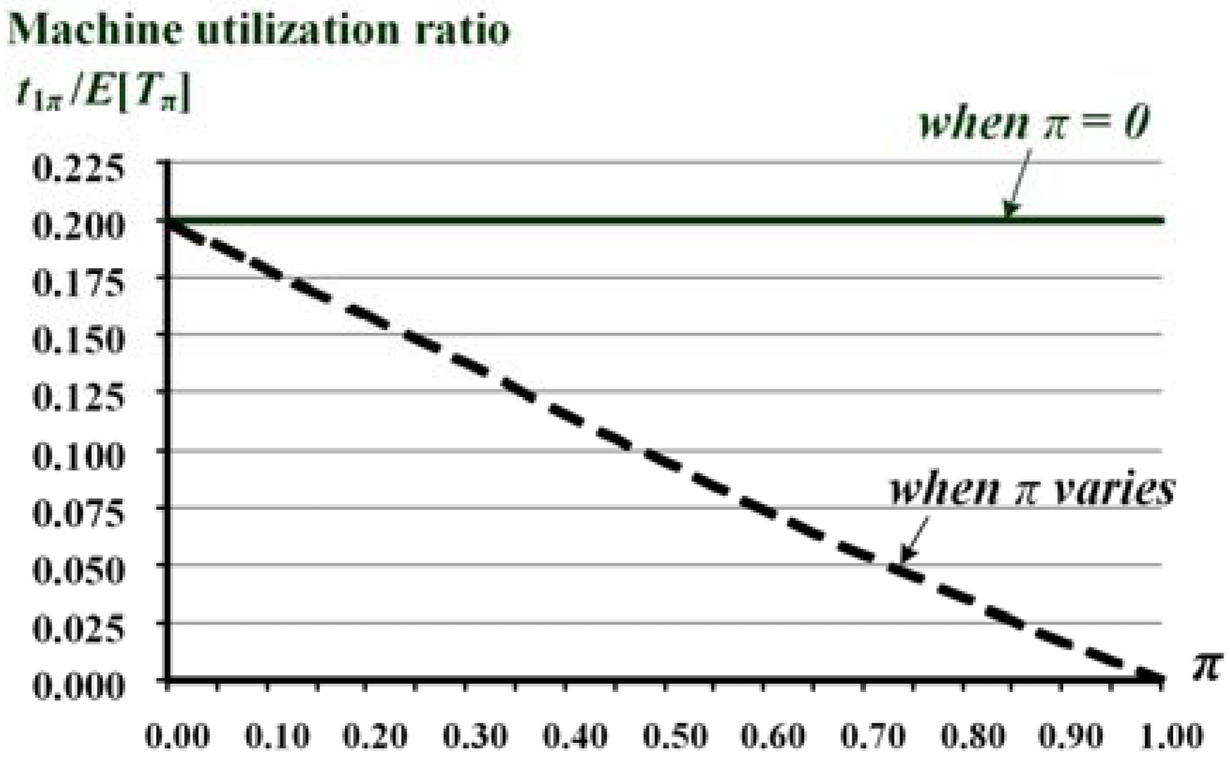 Figure 8 depicts the effect of variations in outsourcing proportion π on the machine utilization ratio (i.e., t1π/E[Tπ]). It demonstrates that as the outsourcing proportion π increases, the in-house machine utilization ratio declines accordingly. This information can assist production managers in scheduling the multi-product fabrication plan.