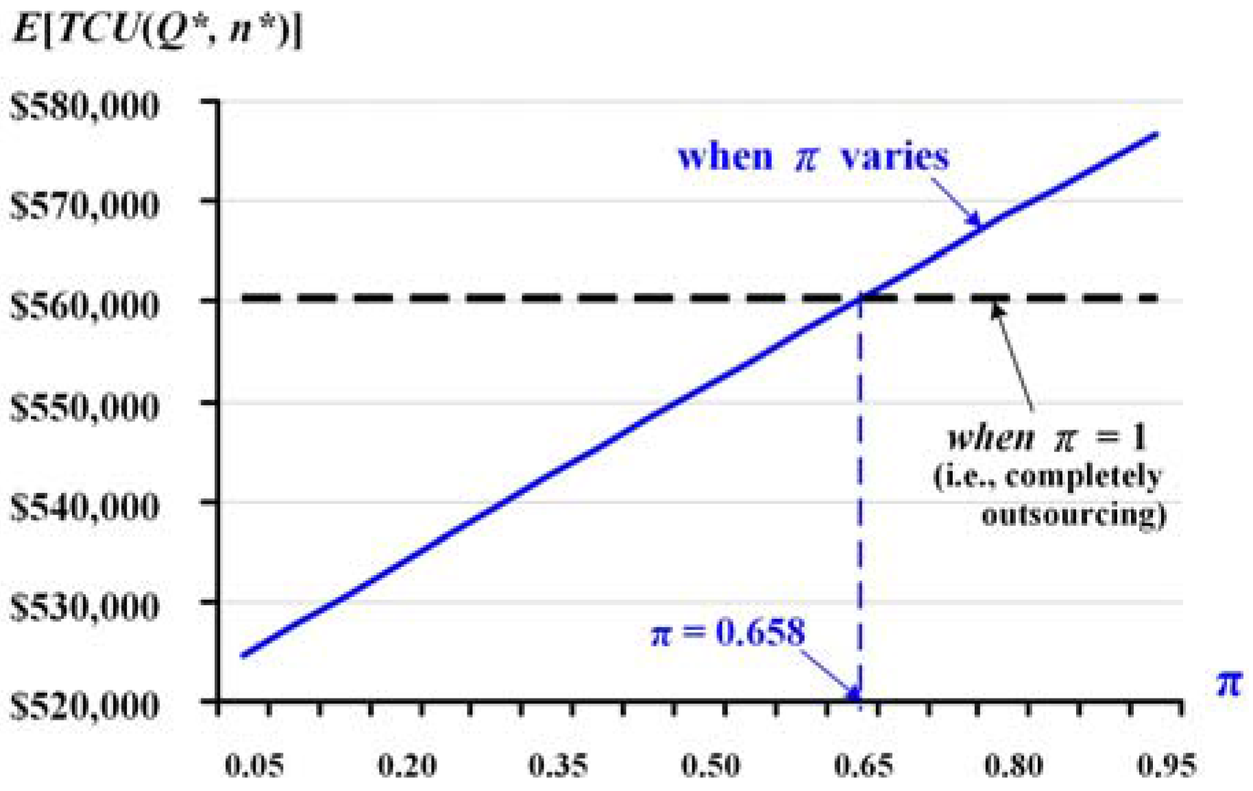 From Table 2, for π = 0.4, we can find (Q*, n*) = (1229, 3) and E[TCU(Q*, n*)] = $545,344, as shown earlier in the example. A further analytical result reveals that a critical outsourcing proportion π = 0.658 exists (see Figure 9). It means that in the numerical example, if the outsourcing proportion π is greater than the critical point (i.e., π > 65.8%), then the completely outsourcing policy (i.e., π = 1) becomes the better choice than a partial or no outsourcing option, in terms of cost savings.