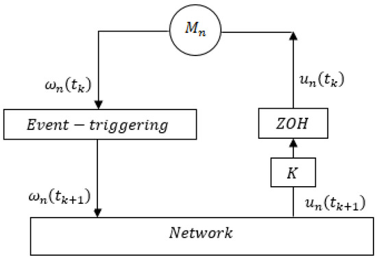 Block diagram of the proposed system with a single motor, where Mn is the single motor, is the event at which the single agent () agent is triggered, is the speed of motor, is the control signal, ZOH is the zero order hold, and K is the gain.