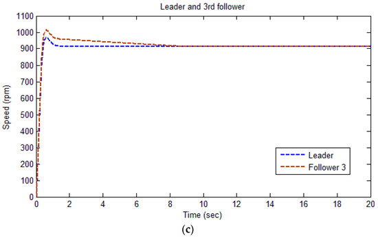 Speed trajectory between the leader and the first follower (a); between the leader and the second follower(b); and between the leader and the third follower (c).