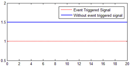 Thus, it is shown in Figure 4a–c and Figure 5 that the consensus is reached among the leader and followers, such that all the following agents regulate the speed in synchronization with the leader. Figure 6 provides the time at which events are triggered between intervals [0, 20 s]. Figure 6 also validates the energy saving strategy as compared to the system without event-triggering schemes.