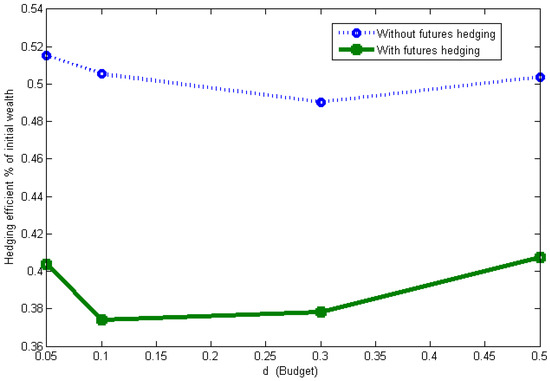 In this paper, we set the budget, marked as C, equal to a proportion d of the current value. Larger d means more budget. We give the effect of budget on the hedging efficiency in Figure 4. We keep the other parameters invariant, and only change d. Let . Take as an example: it means that the investor spends an amount of cash of 3145 on options hedging. β is set as 0.5.