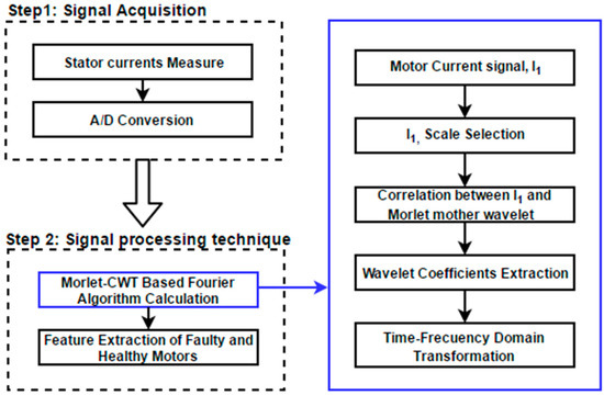 Figure 2 shows the fault detection algorithm developed in two steps. Step 1: the signal acquisition through MSCA method; and Step 2: the Morlet-CWT signal processing technique application.