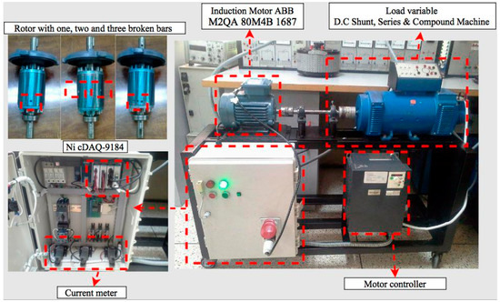 The motor test bench control and the data acquisition system are implemented through the LabVIEW® environment. The tests are performed at different speeds with full- and non-load using both a healthy motor and a faulty motor with one, two, and three broken bars. The current signal processing and the fault detection technique are developed in Matlab® (Version 9.1, MathWorks, Natick, MA, USA).