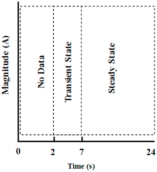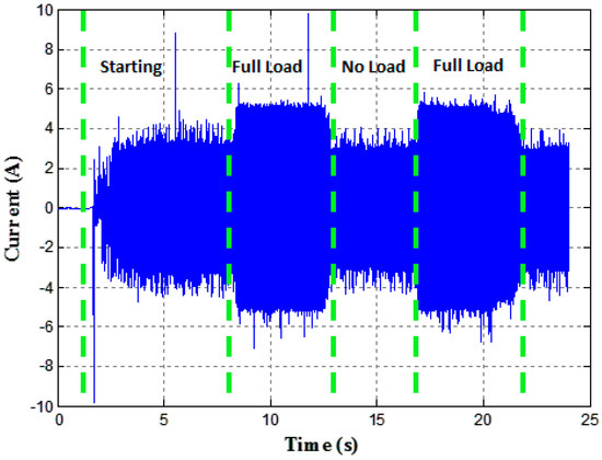 The experimental validation is accomplished in the motor test bench developed by the Electrical and Electronics Department at Universidad de las Fuerzas Armadas ESPE. The motor test bench configuration is shown in Figure 3, and includes: a three-phase squirrel cage induction motor with the features presented in Table 1; three current meters used to measure the stator current; a controllable load; a motor controller to keep constant the motor speed; and a National Instruments (NI) data acquisition board NI cDAQ-9184, which is configured to acquire the current signal data in time periods of 24 s at 25 kHz sampling rate (i.e., N = 24/(40 × 10−6) = 600,000 samples, with N being the number of samples in 24 s). Note that Morlet-CWT generates distortion at the edges of the motor current signal spectrum, since the calculation algorithm (i.e., Fourier space) considers that the studied signals are periodic. To overcome this drawback, the motor is started after a time interval of 2 s, as shown in Figure 4.