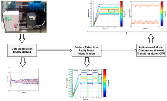 The block diagram of the proposed procedure is presented in Figure 5, which is composed of the following blocks: Block 1 performs the motor current signal acquisition automatically using the MCSA method; Block 2 analyzes the current signal by means of Continuous Wavelet Transform and obtains a graphical representation of the current signal spectrum, where fluctuations produced by broken bars can be observed; and Block 3 extracts the features of the current signal spectrum for faulty and healthy motors.