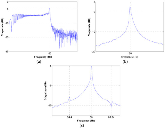 Figure 9a,b show the spectrum of the stator current signal of a healthy motor and a faulty motor with three broken bars, respectively, operating at non-load. Both spectra have similar behavior with 6 lines representing the wavelet coefficients of motor current signal for different scales and translations, which are located at 47, 51, 55, 67, 72 and 80 Hz. Furthermore, the healthy motor exhibits small distortions in the spectrum due to noise coupled to the signal, as shown in Figure 9a, whereas the faulty motor exhibits a ripple, ∆f, in 55 Hz and 67 Hz, due to the harmonic component in the stator current induced by the fault (i.e., broken bars), as shown in Figure 9b. Conversely, the spectrum of the current signal of a faulty motor with three broken bars operating at non-load achieved through the FFT technique is shown in Figure 9c, where it can be seen that the harmonic components induced by the fault are unidentifiable.