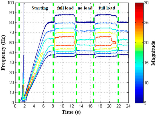 Conversely, Figure 8 shows the spectrum obtained by means of the continuous Morlet wavelet transform. The current signal characterization in the time-frequency spectrum is proposed to inspect, in a simple way, the disturbances that occur in a motor when it operates at non- and full-load. This spectrum is a two-dimensional graph representing the wavelet coefficients frequency, time, and amplitude achieved. On the basis of this graph, the signal spectrum can be quickly analyzed. The y-axis represents the frequency of the analyzed signal, the x-axis presents the signal time interval, and the line colors indicate the wavelet coefficient magnitude. Therefore, it is possible to detect the time intervals when the motor starts and when the motor is operating at non- and full-load. Consequently, the CWT technique concurrently facilitates and reduces the fault detection process complexity with respect to the Fourier analysis. In short, the analysis processing task and its complexity are reduced, since all information is summarized in a single spectrum.