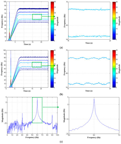 Figure 7 shows the spectrum achieved through the FFT technique. The harmonic components related to the motor failure (i.e., one broken bar in this case) are overlapped close to the motor’s operating frequency, making fault identification difficult at a glance. Therefore, it is necessary to conduct some extra tasks to solve this problem, such as signal filtering, signal decomposition in intervals with/without load, and spectrum evaluation, all of which increase fault detection complexity. Figure 7a–c shows the spectrum obtained through the FFT technique applied to the current signal presented in Figure 6. As can be appreciated, three graphics are needed to analyze the different motor states. Figure 7a presents the current signal spectrum at motor starting, whereas Figure 7b,c show the current signal spectrum when the motor is operating at non-load and full-load, respectively. Note that the fault is visible only when a motor is analyzed at full-load. In addition, this process involves more analysis time and requires knowledge of the load at which the motor is operating (i.e., rotor slip), which increases the difficulty of fault diagnosis in an electric machine.