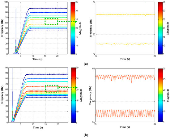 Figure 10a displays the spectrum obtained for a healthy motor, where small variations in the lines close to the motor operating frequency can be appreciated. Conversely, Figure 10b depicts the spectrum for a faulty motor with three broken bars, where the main difference with respect to the healthy motor lies in the ripple appearance at the frequency levels close to the motor operating frequency. Consequently, the failure can be identified by measuring the ripple amplitude and its oscillations. The lower sideband is specifically related to broken bars, whereas the upper sideband is related to the subsequent speed oscillation [3].
