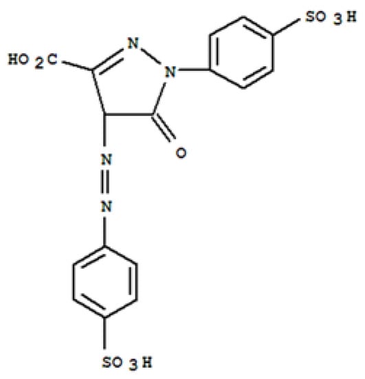 Developed countries are facing a serious problem of water pollution caused by dyes. Synthetic dyes are significant water contaminants and industrial pollutants. Azo dyes, the greatest class of synthetic dyes utilized in the food industry, are specified by the appearance of one or more azo bonds –N=N– on par with one or more aromatic systems. In general, these dyes cannot be eliminated by conventional water treatment systems []. Hence, the elimination of dyes from wastewater has become a matter of concern for the relevant industries. The advancement of highly-efficient techniques for the removal of dangerous pollutants from air, soil, and water is one of the most active fields in environmental research [].