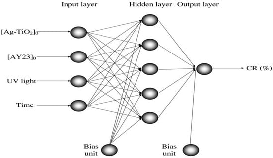 Generally, the behavior associated with the photochemical system is quite complicated. Therefore, the advancement of reliable and robust predictive models is still required for the elimination of organic pollutants. Numerable modeling techniques based on artificial intelligence, like artificial neural networks (ANNs) and imperialist competitive algorithm (ICA) have appeared as adsorbent tools and have represented a better potential for modeling complicated systems [,,,,,,,,,]. The training of ANNs can be done with real data in order to take up issues related to complex and nonlinear problems where mathematical modeling may be too unsuitable or complicated. ANN is based on the minimization of the empirical risk which will compel the solution to be enclosed in a local minimum as well as over-fitting of the network [].