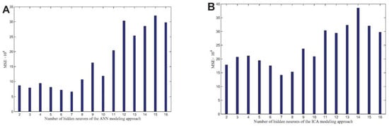 Implication of the quantity of neurons embedded in the hidden layer on the efficiency of the (A) ANN and (B) imperialist competitive algorithm (ICA) modeling schemes.