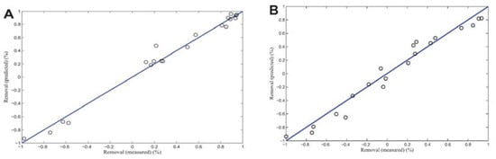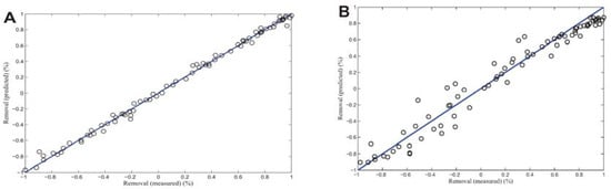 Considering both training and validation sets, the model forecasted and experimentally computed values of the withdrawal of AY23 in water are displayed in Figure 4 and Figure 5, respectively. It distinctly reveals that the outcomes of the ANN scheme are in similar phase when compared with the corresponding experimental outcomes taking into consideration both cases, training (Figure 4A) and the validation sets (Figure 5A).