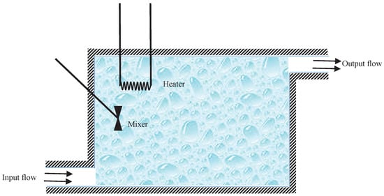 A tank with a heating system is displayed in Figure 1, where , the thermal capacitance is also the temperature is ψ. The model is formulated as follows [,],